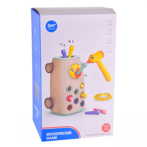Час нагодувати маленьке пташеня дятла, бо він вже зовсім зголоднів, а їсти йому треба багато! Він вже в очікуванні смачного черв'ячка. Іграшка поєднує у собі кілька ігор одночасно, які подарують дитинці весело проведенний час та безліч розваг. Магнітна гра буде відмінним варіантом для вашої дитини вашої дитини щоб розвивати дрібну моторику та координацію рухів. За допомогою магнітної сторони молоточка можна дістати черв'ячка і нагодувати голодне пташеня. А якщо черв'ячки ховаються, це стимулює у дитини спостережливість та увагу.