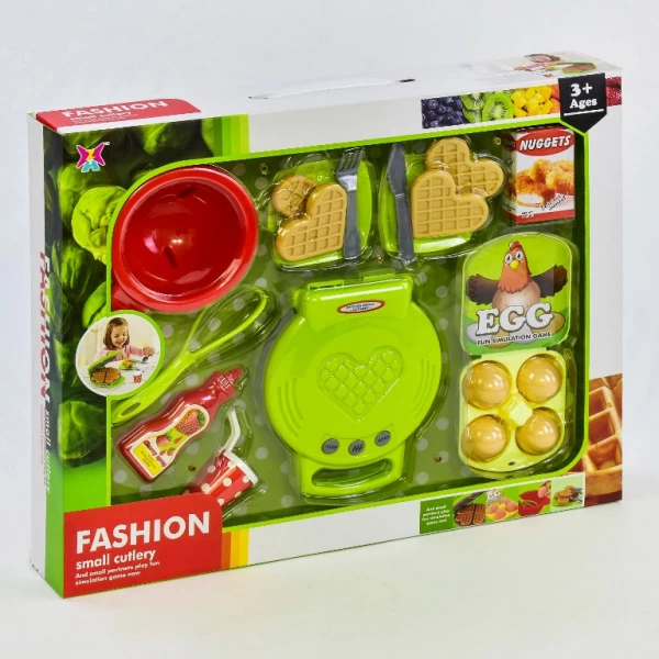 набор продуктов, фаст-фуд, дитяча кухня, ігровий набір кухня, кухня для дівчаток, вафельница, музична, вафля, віночок, миска, тарілка, вилка ложка, ніж, склянка, мірний стаканчик, яйця, молоко, джем, полуниця, соус