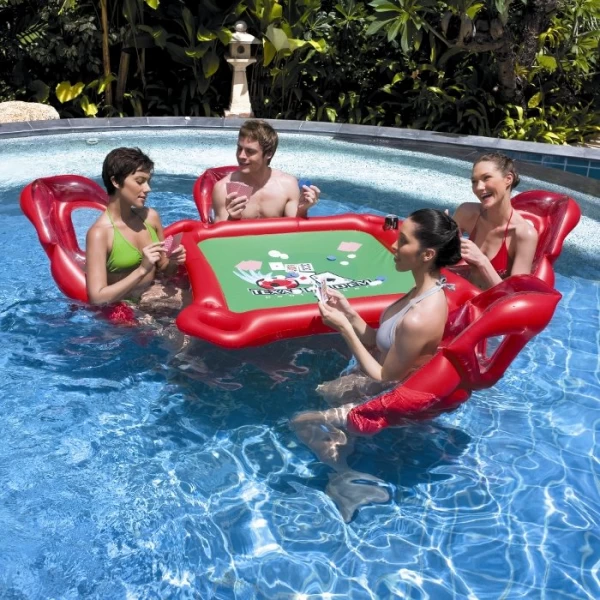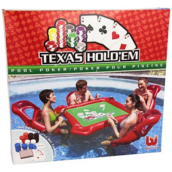 Оригинальное решение – Набор для игры в покер на воде 43096 BESTWAY Texas Hold’em Pool Poker. Удобно устроившись в надувных креслах в бассейне, Вы с друзьями весело проведете время за игрой в покер. Отлично и комфортно отдохнете, и получите море положительных эмоций. В наборе есть все необходимое. Надувной столик с бортиками, чтоб не заливала вода. Столик имеет выемки для фишек. Четыре раскладных надувных кресла с подстаканниками для прохладительных напитков. В кресле удобно сидеть за столиком и играть, а можно разложить и поплавать, как на матрасе.