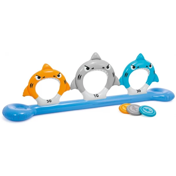 Игровой центр intex 57501 Акулы состоит из надувного "бревна" на котором закреплены три надувных разноцветных кольца с изображением рыбы. Данный игровой центр можно использовать как на суше, например на лужайке возле дома или на природе, так и на поверхности воды, например в бассейне. Игровой центр интекс 57501 позволит весело провести время на свежем воздухе как взрослым так и детям. В комплект этого игрового центра входит мишень в виде трех колец и три метательных диска разного размера.