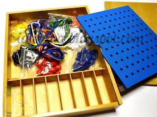 Мозаїчне поле 10х10 осередків, дерев'яні фішки на ніжці (6 кольорів) і 6 шнурків різного кольору.