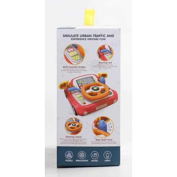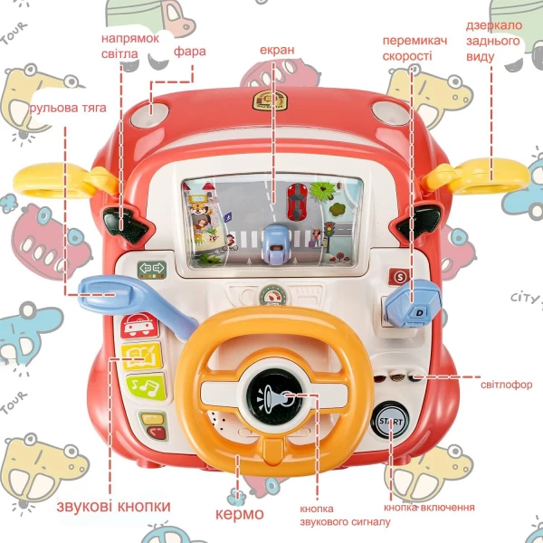 Музична іграшка виконана у вигляді автомобіля рожевого кольору із повноцінним кермом, коробкою перемикання передач та важелем, який вмикає поворотники. Музичне кермо детально розповість про кожний колір світлофора, правила дорожнього руху та дасть можливість одразу попрактикуватись на імпровізованій дорозі. Натискайте на “Start” та вирушайте у подорож містом!