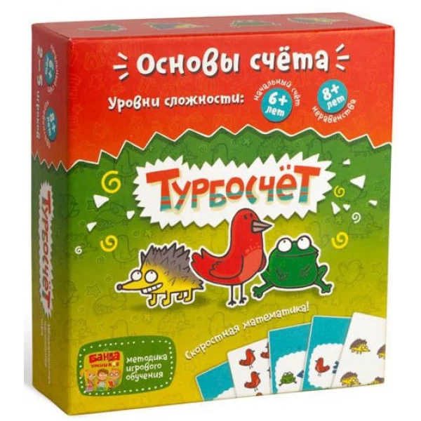 «Турбосчёт» допоможе дошкільнятам ефективно навчитися рахунку і порівнянню чисел в цікавій ігровій формі. Школярі будуть розвивати і зміцнювати ці навички. Ступінь складності гри легко міняти, прибираючи або додаючи карти більш високого рівня. Якщо ви не хочете, щоб діти рахували швидше за вас, приєднуйтесь! Дорослі грають в «Турборахунок» з не меншим азартом. Ця гра - ідеальний варіант дозвілля в затишному родинному колі.