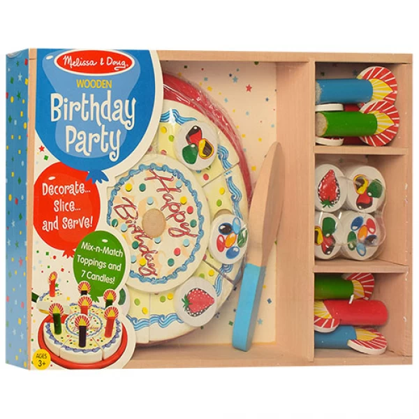 В праздничном наборе идет торт, яркое блюдо и удобная лопатка. Все элементы игрушки выполнены из дерева, окрашены безопасными красками.