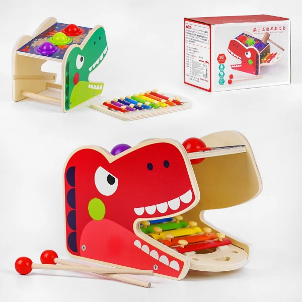 Цей кумедний динозаврик точно знає, що розважити малюків можна цікавими іграми з кольоровими деталями та звуковими елементами. Дайте дитині три кульки різних кольорів та попросіть знайти відповідні осередки. Потім запропонуйте проштовхнути їх усередину спеціальним молоточком. Падаючи, кульки потраплятимуть на елементи ксилофона, відтворюючи цікаві звуки.