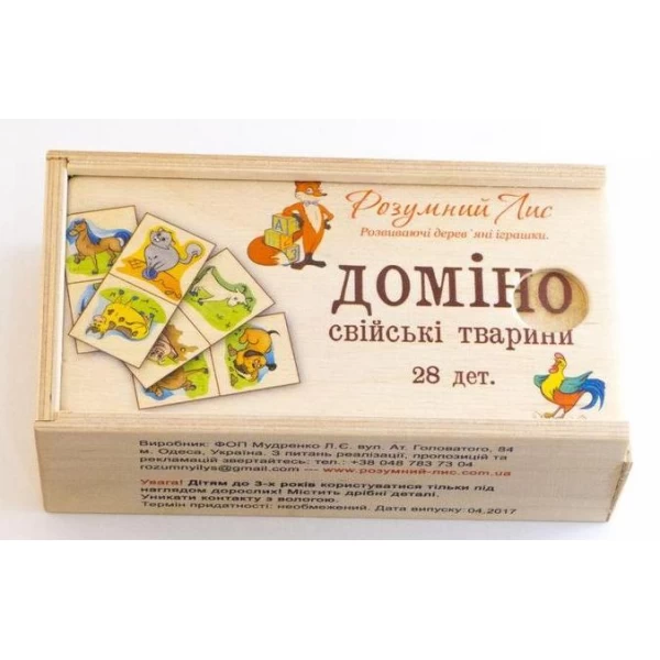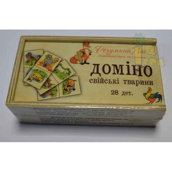 Домино «Домашние животные», состоит из деревянных 28 костяшек, рисунок на которых напечатан прямо на дереве, что обеспечивает долговечность игрушки. Детское домино — одна из первых настольных игр, в которую можно поиграть с малышом.