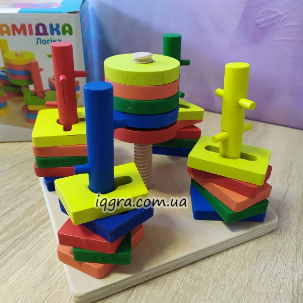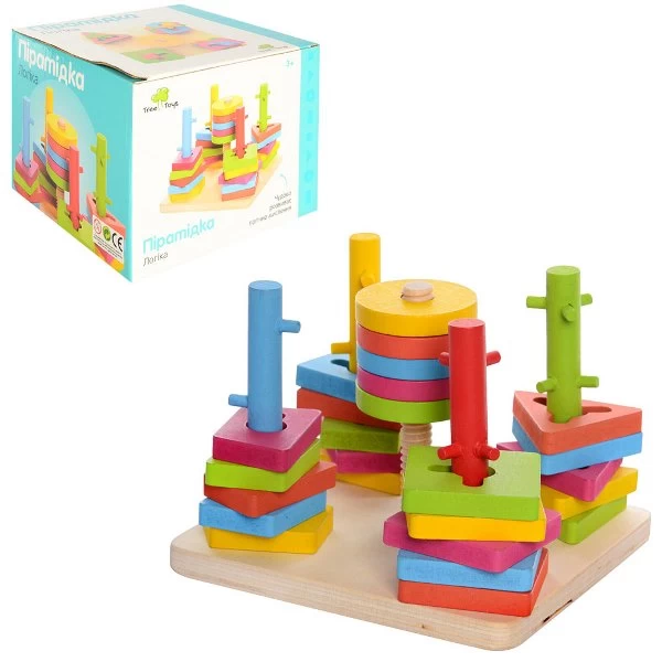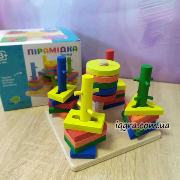 Деталі пірамідки великі, без гострих кутів, пофарбовані в основні кольори: червоний, зелений, жовтий, синій.