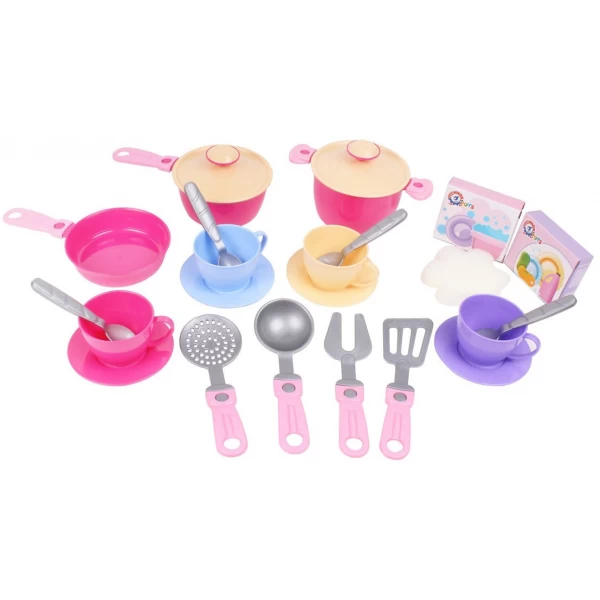 Ваша маленька господиня зможе втілити свої кулінарні фантазії у реальність. Каструлі та сотейники для смачних страв, сковорідка для смаження – все, що потрібно для захоплюючої гри у кухаря. Набір включає шумівку, черпак та лопатку, надаючи грі максимальну реалістичність. Друзі запрошені на чаювання – з різнокольоровими чашками та блюдцями створіть атмосферу справжнього застілля.