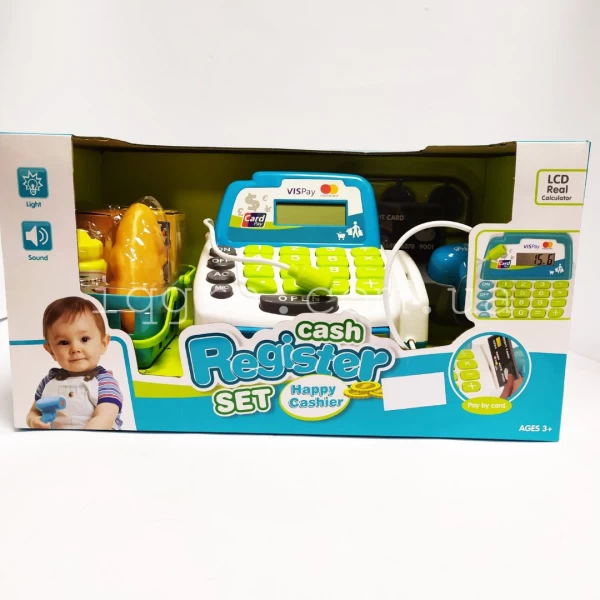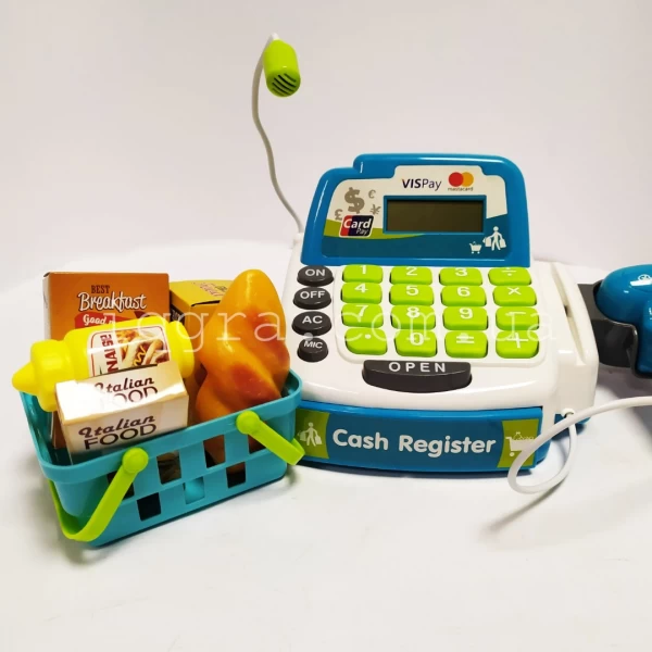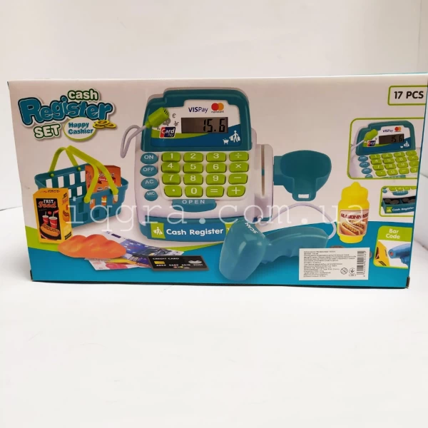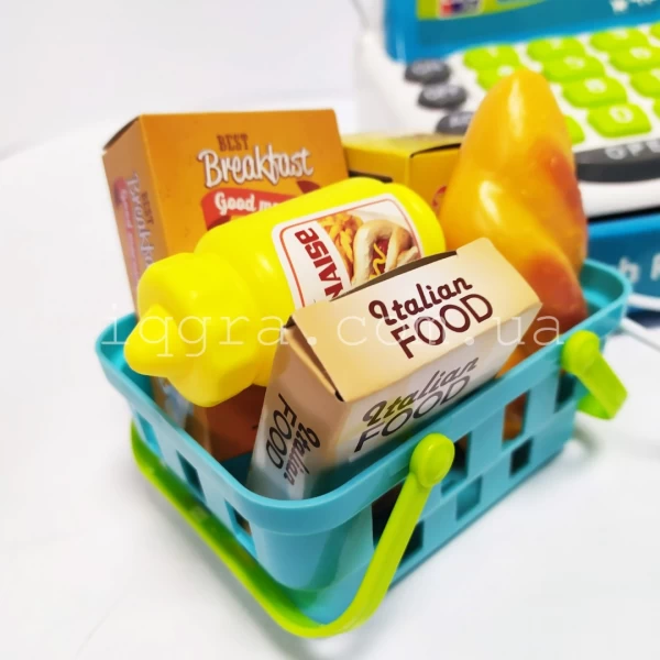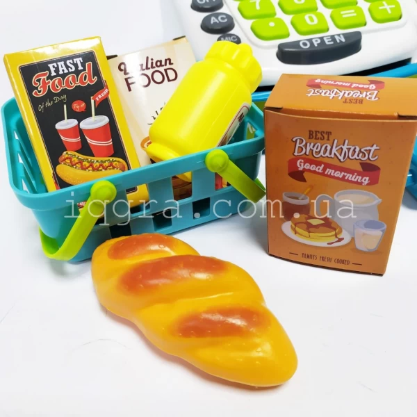 Каса з грошима відкриється тільки після натиснення відповідної кнопки. Також в наборі присутній функціональна платіжна карта. Щоб грати було ще цікавіше в комплекті ви знайдете цілий набір свіжих продуктів в кошику.