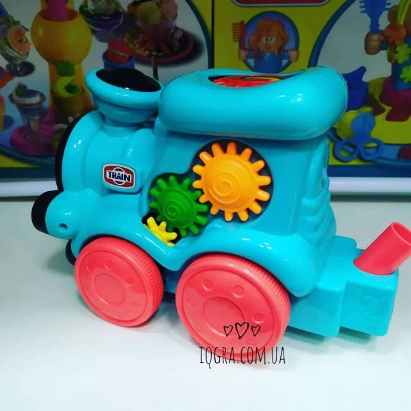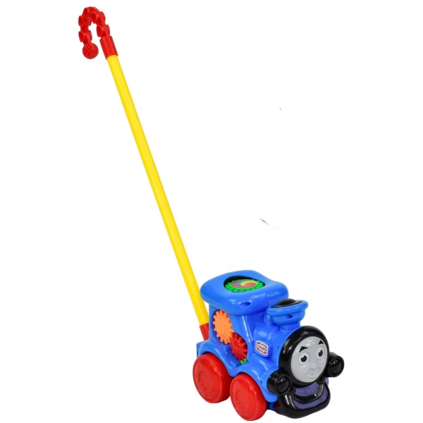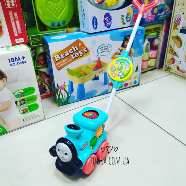 Основа каталки 0375 виконано у вигляді веселого паровозика Томаса з мультфільму. Завдяки великим колесам малюкові буде легко його котити, а кумедні шестерінки та звуки будуть його розважати, утримуючи надовго увагу.