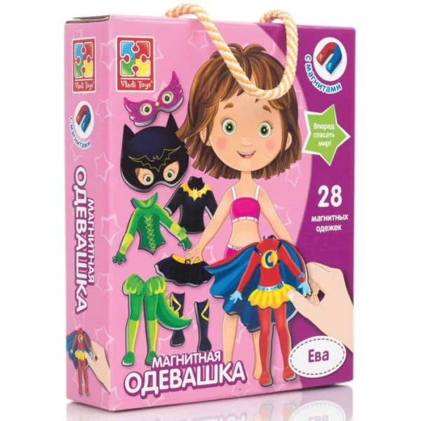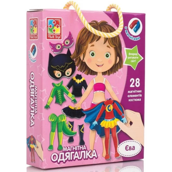 Хтось потребує допомоги супергероя? Єва миттю подолає всі перешкоди! Вдягніть ляльку в різні костюми та читайте, яку силу вона здобуває! Розгляньте одяг на магнітах. На кого перетвориться Єва в кожному вбранні? Дівчинка-кішка, Рожевий Плащ, Неонова Ящірка, Бетгерл. У книжечці інструкції ви знайдете приклади, як можна сполучати предмети гардероба. А також багато розвиваючих завдань, які тренують логіку, пам’ять, увагу.