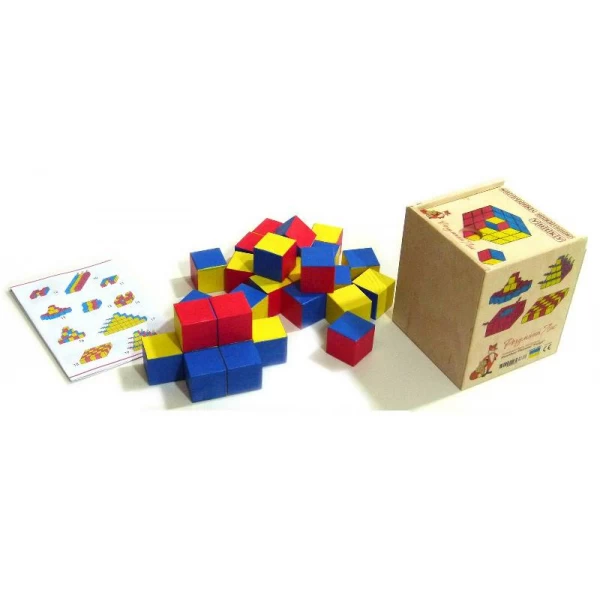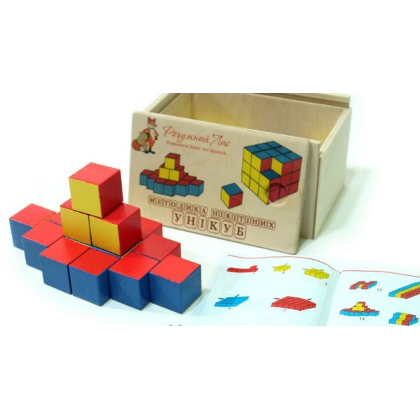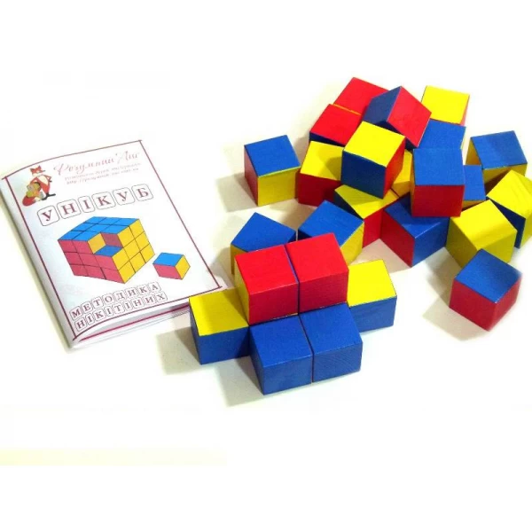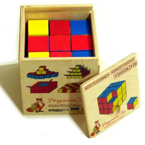 Уникуб представляет собой 27 небольших деревянных кубиков с цветными гранями. Ребенку нужно составлять из них различные трехмерные фигуры и композиции по предлагаемому схемам. Игра предназначена для детей от 1,5 лет.