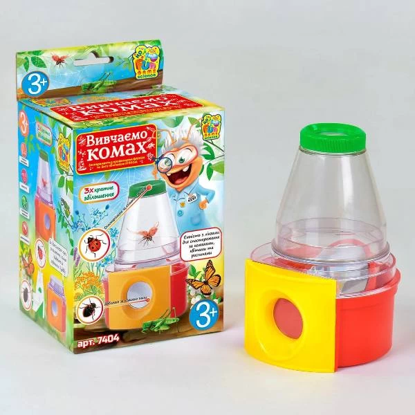 Науковий набір Вивчаємо комах «Вивчаємо комах» від ТМ Fun Game - це перша міні лабораторія для дітей шкільного віку. Набір натураліста з лупою і системою дзеркал допоможе дітям проводити дослідження як справжнісінькою лабораторії! Набір являє собою контейнер для комах з двома лінзами, і дзеркалом які дозволяють розглянути комах як зверху так і знизу, спостерігати за з життєдіяльністю. У наборі для комах банку пластикова з кришкою лупою з триразовим збільшенням. Діаметр лінзи - 30 мм, підстава 102х150 мм. Крім того, спостерігати можна не тільки за комахами, а й за камінчиками, квітами, листочками і багато іншого!