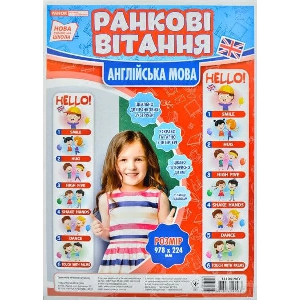 Ранкова зустріч — це зустріч дитини на початку дня з педагогом чи вихователем. Завдання цього заходу — створити дружню атмосферу в класі та налаштувати кожну дитину на навчання та пізнавання цього світу. Ранкові вітання – це найголовніше у ранкових зустрічах. Набір допоможе дітям зняти напругу, налаштуватися на потрібний лад та почуватися комфортно в класі чи групі. «Ранкові вітання. Англійська мова» — це яскрава прикраса інтер’єру групи або класу та чудовий помічник у навчанні англійської мови. Плакат потрібно повісити при вході у навчальне приміщення. Діти, зайшовши в клас, уже знають, як будуть вітатися з педагогом чи вихователем. Танцюйте, посміхайтеся, обіймайтеся та запам’ятовуйте назви цих дій англійською! Плакат стане надійним помічником учителям та вихователям на заняттях з англійської мови та на ранкових зустрічах.