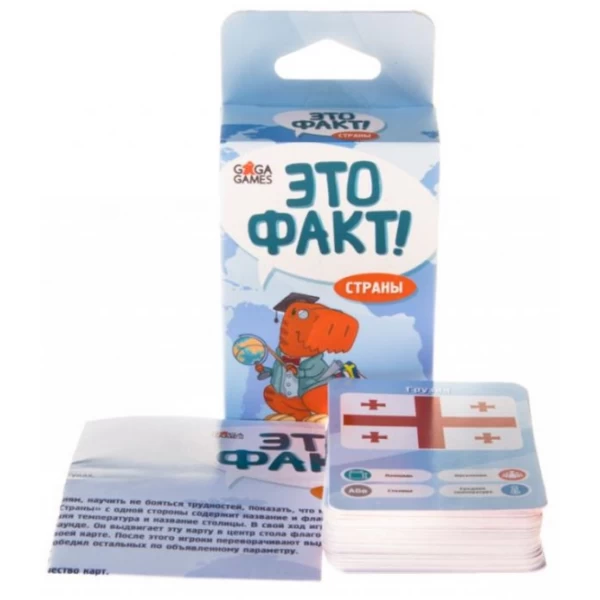 Факты говорят сами за себяЧтоб узнать о странах интересные факты, не обязательно читать учебники – гиды, посещать все уроки географии или, как самый простой способ, смотреть один за другим выпуски «Орла и Решки». Можно просто сыграть в настольную игру Это факт! Страны и пополнить свой багаж знаний новыми увлекательными фактами. Верным и добрым помощников в игре станет динозавр Фактозавр, который и провёдет вас в мир фактов и знаний.