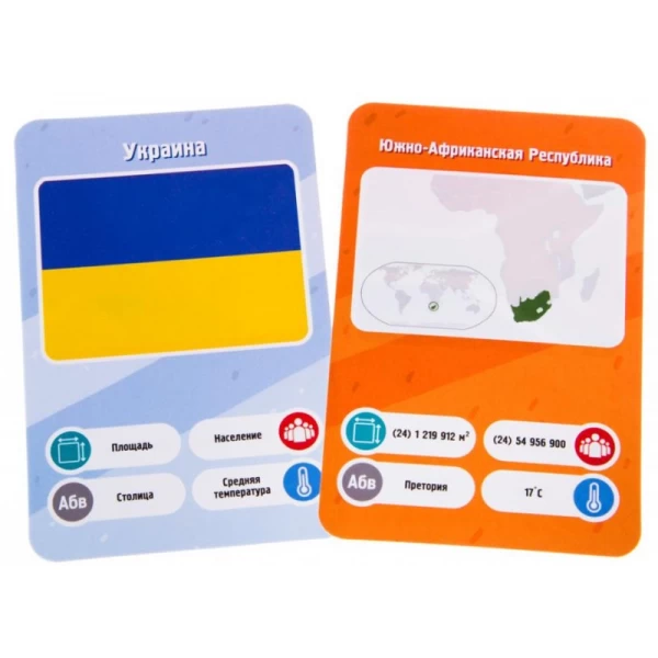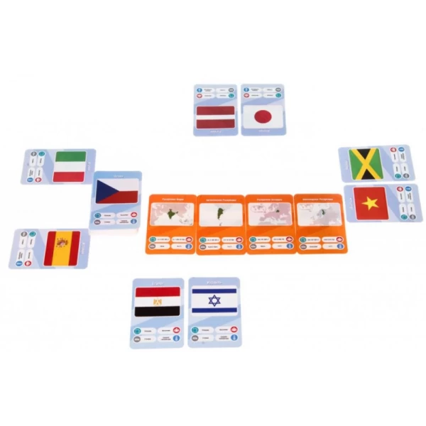 Итак, в начале партии каждый участник получает по три карточки, на рубашке которых написано название страны и изображен её флаг, а на лицевой указаны площадь, численность населения, название столицы и средняя температура воздуха. Игроки кладут карточки перед собой, рубашкой вверх. Теперь игроки по очереди предлагают соперникам пари о том, какая из стран превосходит остальные по одному из указанных параметров, например, какая из стран имеет наибольшую площадь по сравнению с остальными выложенными. Участники делают свои «ставки», выдвигая вперед карточки. Затем карты переворачиваются, и страна, опередившая остальных, объявляется победителем, а ее владельцу достаются все сыгранные карты в качестве победных баллов. На пустые места выкладываются новые карты, и своё условие предлагает следующий участник.