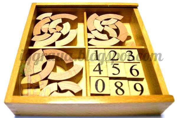 3 розрізаних циліндра і 9 кубиків з цифрами, в кубиках є отвори.