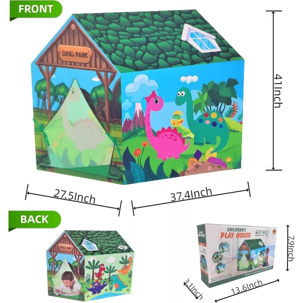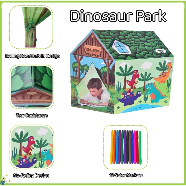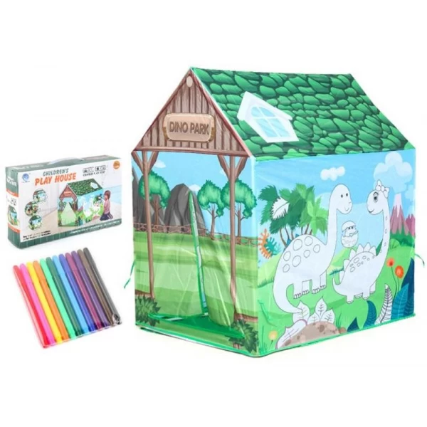 Влаштуйте особливу атмосферу у дитячій кімнаті разом з тематичним наметом “Дино парк”! Виконаний у вигляді будиночка, він має кольорове забарвлення та цікаві тематичні малюнки. Одна зі стін намету представлена у вигляді розмальовки, тож дитина має можливість самостійно її розфарбувати, додавши яскравих кольорів.