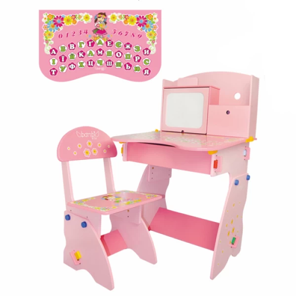 Парта W 071 со стульчиком в розовом цвете. Парта обязательно понравится вашей дочке. На столешнице изображен алфавит и циферки.