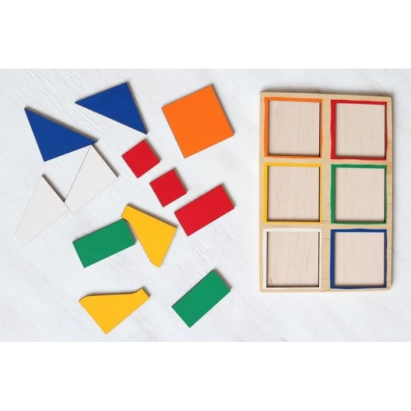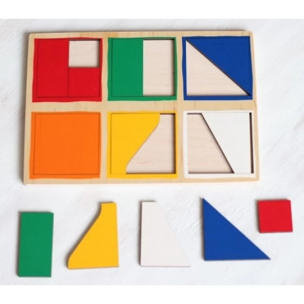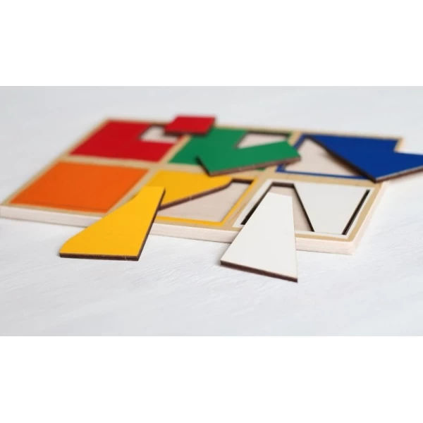 Детская деревянная игрушка состоит из 2-х планшетов. В каждом из них размещены 6 квадратов, которые в свою очередь делятся на 2-3 элементы. Игровое задание - составить все 12 квадратов. Перед использованием, следует перевернуть планшеты, чтобы из них выпали составляющие, а дальше предложить ребенку сложить квадраты по очереди, при этом каждая фигура должна быть размещена в свой, по цвету, квадрат.