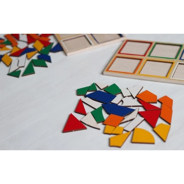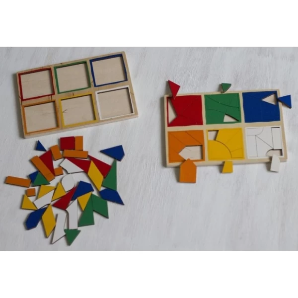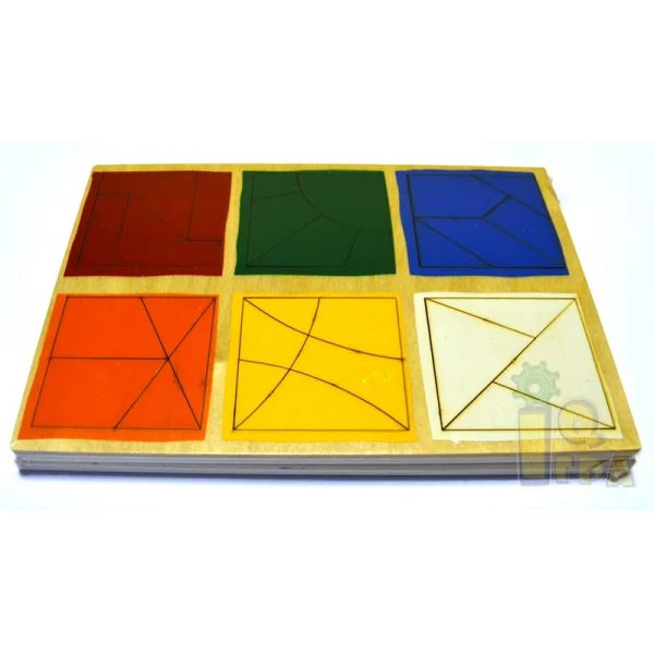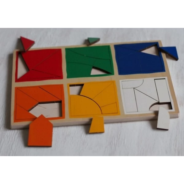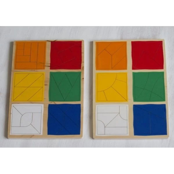 Детская деревянная игрушка состоит из 2-х планшетов. В каждом из них размещены 6 квадратов, которые в свою очередь делятся на 4-6 элементы. Игровое задание - составить все 12 квадратов. Перед использованием, следует перевернуть планшеты, чтобы из них выпали составляющие, а дальше предложить ребенку сложить квадраты по очереди, при этом каждая фигура должна быть размещена в свой, по цвету, квадрат.