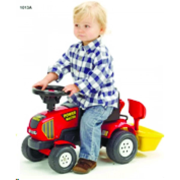 Трактор-каталка - яскрава стійка машинка для маленьких водіїв зі знімним причепом. До причепа також додаються граблі та лопатка. Комфортне сидіння знаходиться на оптимальній висоті від землі, щоб дитині було зручно відштовхуватися ніжками. Машину надає руху сама дитина, розвиваючи свою м'язову систему