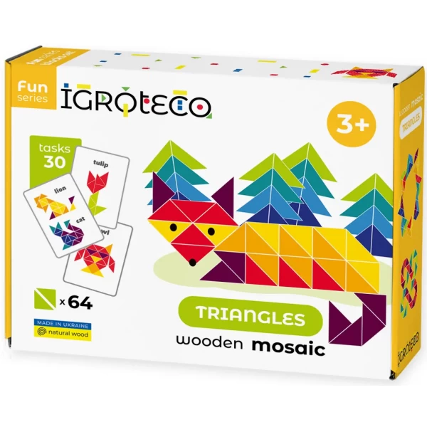 Оригінальна дерев'яна мозаїка від ТМ Ігротеко складається з 64-х різнокольорових елементів трикутної форми, з яких можна викладати стилізовані зображення тварин, рослин, предметів побуту, цифри і букви, геометричні форми, орнаменти та безконечники.